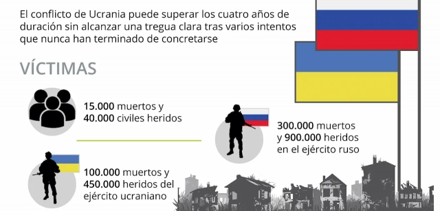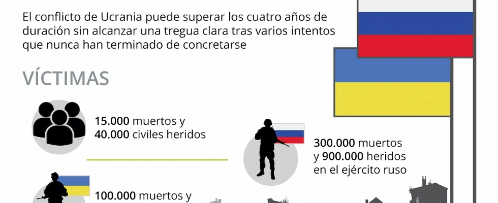 Cuatro años de la guerra de Ucrania / Infografía: EA El conteo de bajas y víctimas mortales a causa de la guerra de Ucrania prosigue sin fin. Después de cuatro años de enfrentamiento, ambos bandos sufren con dureza las consecuencias del encarnizado conflicto. Los dos ejércitos se han visto afectados en gran medida, con mayores números absolutos en el caso ruso, que ha sufrido unos 300.000 muertos y unos 900.000 heridos, las mayores pérdidas de una gran potencia desde la II Guerra Mundial.
