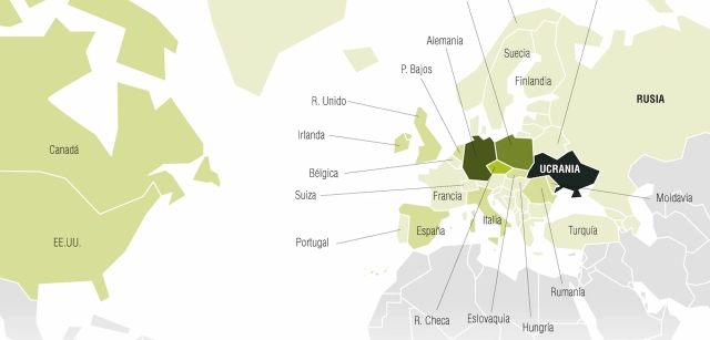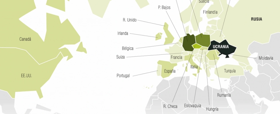 El principal núcleo de acogida europeo se encuentra en el centro del continente, en una ruta de salida que parte desde el oeste de Ucrania y une los tres países con mayor número de refugiados: Alemania, Polonia y la República Checa. Lejos de este núcleo central hay otros destinos en la periferia europea que también han acogido a la comunidad ucraniana como Reino Unido, España o Italia.