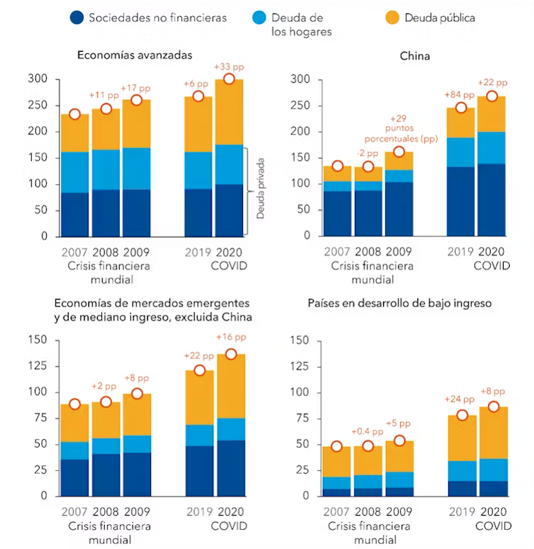 - Según el FMI, aunque los países de bajos ingresos mantienen unos niveles de deuda externa inferiores a otros grupos de países (entre el 75 % y el 85 % de su PIB), han visto casi triplicar la proporción de los pagos por servicio de la deuda externa respecto de sus ingresos tributarios desde el 6 % hasta el 14 % y, en algunos casos, desde el 9 % hasta el 25 %.