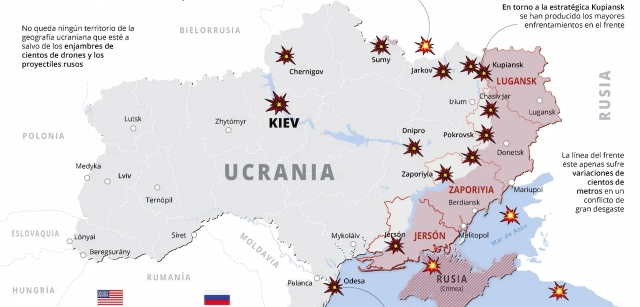 El conflicto continúa estancado en el frente mientras se intensifican los ataques con drones y la presión internacional pierde foco tras la crisis en Oriente Próximo, sin avances significativos hacia un alto el fuego duradero.