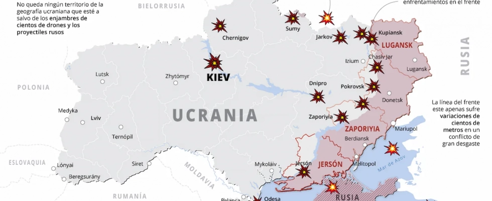 Mapa de la guerra en Ucrania a 21 de abril de 2026 / Imagen: EA El día a día del conflicto viene marcado, como ocurre en los últimos meses, por ataques masivos de drones y proyectiles entre ambos bandos. El ejército ruso envía con frecuencia enjambres de centenares de drones y misiles balísticos sobre toda la geografía ucraniana, en una estrategia que busca desgastar las defensas y saturar los sistemas antiaéreos. Han resultado golpeados enclaves como Sumy, Poltava, Jarkov, Kiev, Zaporiyia o Chernigov, reflejo de un conflicto que afecta a todo el país. En los últimos días han sido especialmente cruentos los ataques sobre Odesa y Dnipro, ciudades clave tanto por su valor logístico como por su simbolismo estratégico.