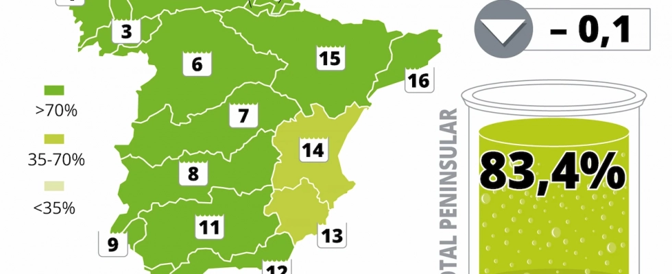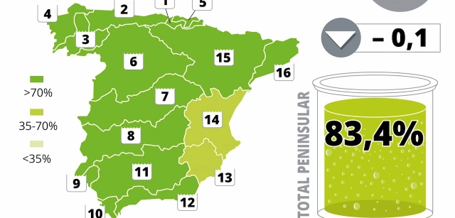 Como ejemplo representativo de la caída generalizada acontecida en la vertiente atlántica se encuentran los ámbitos de la cornisa norte. El mayor descenso es el del Cantábrico Occidental, que pierde 3,1 puntos para quedarse en el 81,8%. A continuación se encuentra la caída de Galicia Costa, con 2,1 puntos menos hasta el 83,0%. De menor entidad resultan las bajadas semanales del Cantábrico Oriental, que se queda con 1,4 puntos y un 90,4%, y el Miño-Sil, con siete décimas menos y una cifra embalsada del 86,8%. Otra semana más el País Vasco se mantiene imperturbable en el 95,2% del total.
