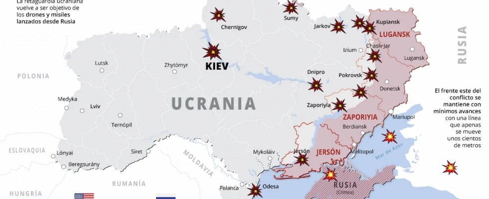 El mayor peso de la ofensiva de ambos bandos sigue guiado por el lanzamiento de proyectiles y drones sobre territorio enemigo, por lo que resultan clave las defensas antiaéreas de ambos países. En el caso de Rusia, puede llegar a todo el territorio ucraniano con su armamento, con ejemplos recientes como los proyectiles estrellados contra un edificio de la policía en Shostka, en la región de Sumy, o sobre instalaciones industriales de Jarkov.
