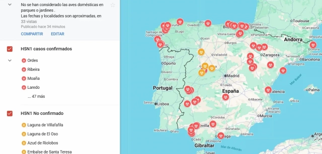 SEO/BirdLife ha publicado un mapa en el que muestra los episodios confirmados o sospechosos en aves silvestres en España. Hasta el momento en él constan más de 50 episodios que afectan a una veintena de especies.