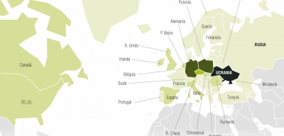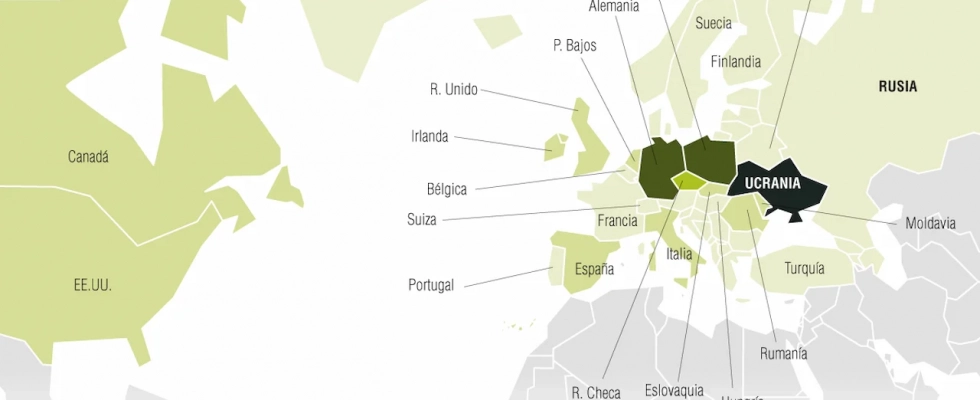 El principal núcleo europeo de acogida está concentrado en torno a Europa Central, especialmente entre Alemania, Polonia y la República Checa, en un triángulo en el que Polonia actúa como primera vía de salida directa de territorio ucraniano y donde Alemania y el país checo son las principales vías de asentamiento en el centro de Europa. Más allá de este eje principal aparecen otros enclaves importantes de refugiados ucranianos en destinos tan variopintos como Reino Unido, España, Rumanía o Italia.