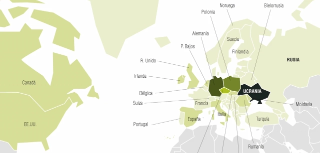En el centro de Europa se concentra el principal núcleo de acogida para los ucranianos, en la intersección entre los tres países que acogen mayor número de refugiados en su territorio, más de 2,7 millones de personas entre Alemania, Polonia y la República Checa. Aparte de estos destinos principales, relativamente próximos a la frontera oeste de Ucrania, otros lugares de la periferia europea también han conformado importantes núcleos de la comunidad ucraniana, como los que se han congregado en torno a las islas británicas, España e Italia.