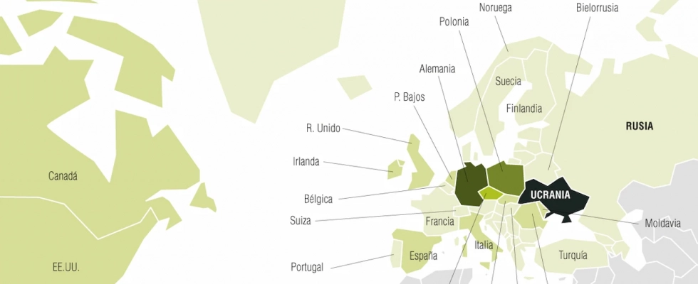 Principales países de destinos de los refugiados ucranianos a 21 de abril de 2026 / Gráfico: EA Con la cifra de refugiados ucranianos en el extranjero estabilizada en torno a los 5,9 millones de personas, durante los últimos meses, la gran mayoría de esta masa de población ha permanecido en el Viejo Continente, un total de 5.374.780 refugiados en países europeos. El resto, apenas un 9% del total, ha debido marcharse a otros continentes, la gran mayoría de ellos hacia Canadá y Estados Unidos.