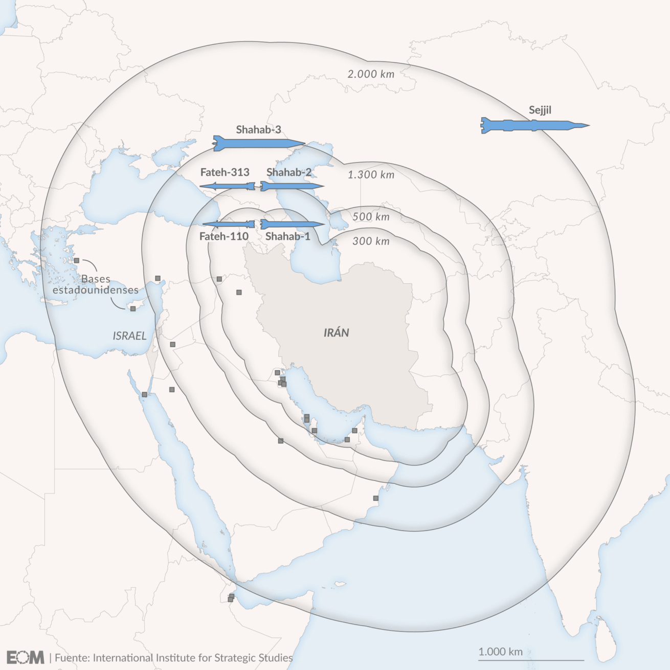 Junto a esto, Irán cuenta con el arsenal de misiles más grande y variado de Oriente Próximo, capaz de alcanzar Arabia Saudí e Israel, pero también objetivos en el mar Rojo, Turquía o incluso el extremo este de Europa.