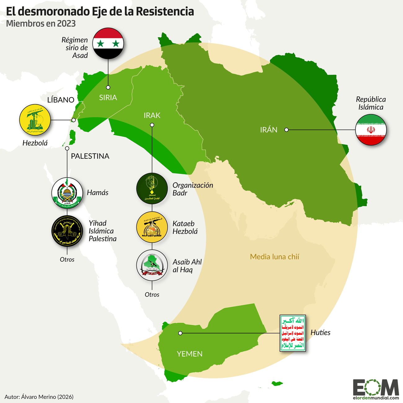 El desmembramiento de Hezbolá, Hamás y el régimen sirio de Asad —tres de los cinco principales integrantes del Eje de la Resistencia— a manos de Israel y las dos rondas anteriores de ataques contra Irán en 2024 y junio de 2025 han debilitado profundamente la red de alianzas de Teherán y erosionado su influencia regional.