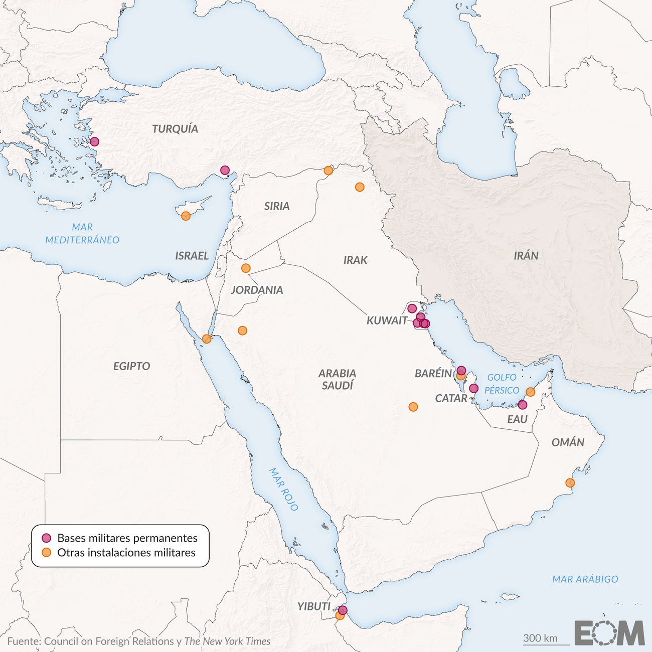 El ataque contra el régimen de los ayatolás se ha apoyado en la extensa infraestructura militar que mantiene Estados Unidos en Oriente Próximo. La potencia norteamericana tiene más de una veintena de bases en trece países de la región. En ellas ya se encontraban desplegados entre 30.000 y 40.000 soldados.