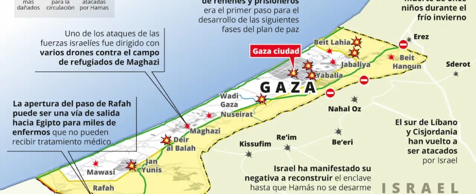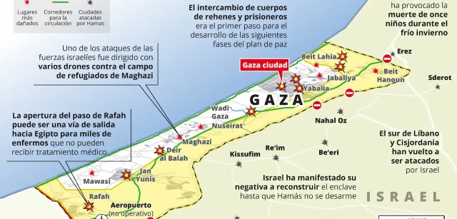 Mapa de la incursión militar de Israel en Gaza, actualizado a 2 de febrero de 2026, con las zonas de combate y avance terrestre / Imagen: EA Más de tres meses después del acuerdo de alto el fuego ha concluido el proceso de intercambio de los cuerpos de los rehenes israelíes por los presos y cadáveres de palestinos. Éste era el primer paso de la tregua y una vez conseguido, no sin dificultades, ambos bandos y las potencias internacionales deben plantearse cuál será el siguiente paso.