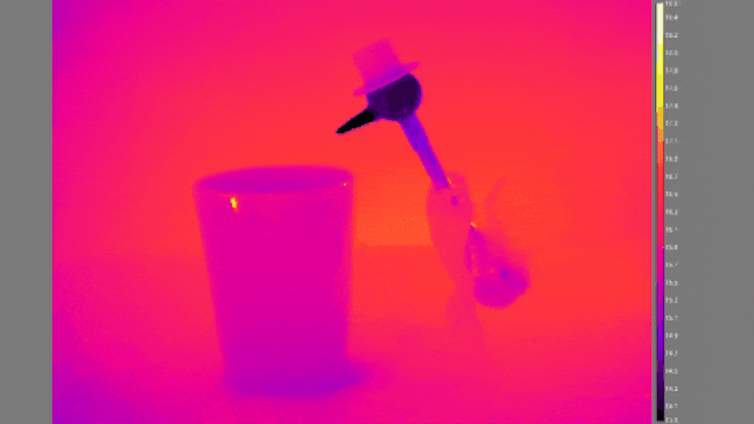 El pájaro bebedor se mueve gracias a la diferencia de temperaturas entre su cabeza y su abdomen. Normalmente, en un motor térmico, se utiliza el ambiente como fuente térmica a baja temperatura y mediante algún proceso, como la combustión, se consigue una temperatura superior. En este caso ocurre lo contrario, se consigue reducir la temperatura respecto a la del ambiente, pero ¿cómo? Aquí entra en juego el sudor.