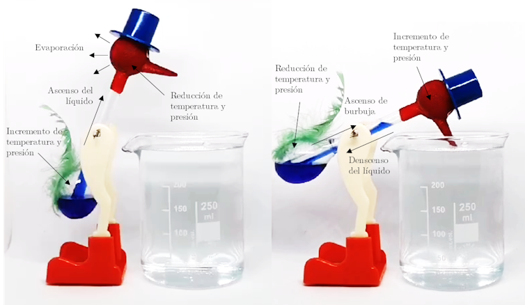 Esto hace que el pajarito, en su balanceo, llegue a desequilibrarse inclinándose hacia adelante para volver a beber.