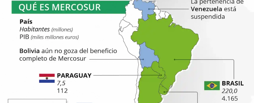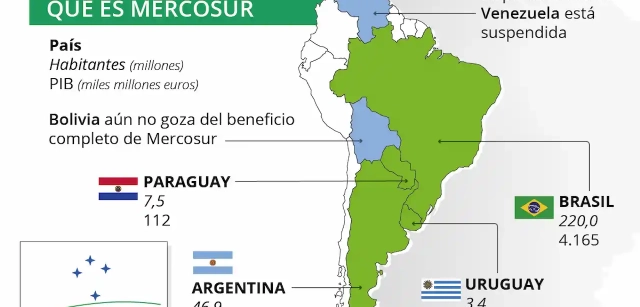 Acuerdo entre Mercosur y la UE / Infografía: EA Mercosur es la principal agrupación comercial de Sudamérica. Está compuesta por cuatro países fundadores (Argentina, Brasil, Paraguay y Uruguay), junto a los que estuvo un tiempo Venezuela, cuya pertenencia fue suspendida hace diez años, y Bolivia, aunque la nación andina aún no ha completado su convergencia con Mercosur. Esta agrupación supone un mercado común de más de 275 millones de personas y una oportunidad comercial de primer nivel.