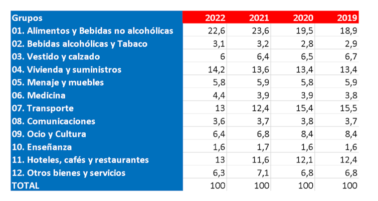 Actualmente, para la elaboración del IPC los artículos se clasifican en 12 grupos con ponderaciones diferentes que se actualizan cada año según la última información proveniente de la encuesta de presupuestos familiares.