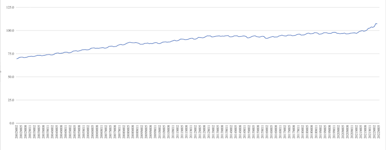 Si en 2002 el nivel del índice se situaba en torno a 70, en 2022 es cercano al 110. O sea que en 20 años ha subido alrededor de un 57 %. Entonces, la inflación acumulada en las últimas dos décadas se ha situado en torno al 57 %. Es decir, el coste de la vida se ha elevado y, para comprar lo mismo, se necesita un 57 % más de dinero.
