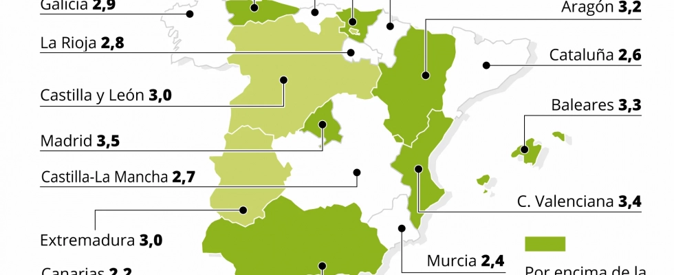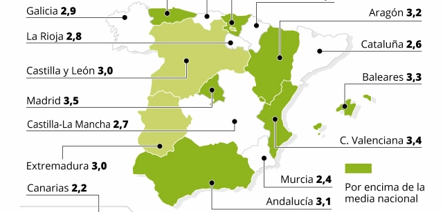 En cambio, Canarias (2,2%) es el lugar con menor crecimiento de precios, seguido de Murcia (2,4%). Por debajo de la media española también se encuentran Cataluña (2,6%), Castilla-La Mancha (2,7%), Cantabria, Melilla, Navarra y La Rioja (2,8%), y Galicia (2,9%). Por último, sólo Castilla y León y Extremadura se encuentran en el dato medio del 3,0%.