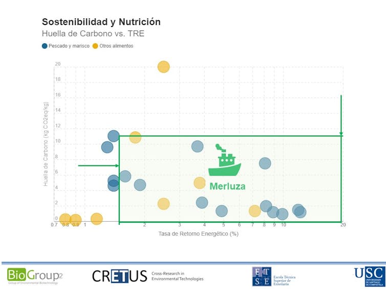 La merluza capturada con palangre de fondo debe poseer un valor máximo de huella de carbono de 10,82 kg de CO₂ eq/kg y una tasa de retorno energética proteica (TREprot) superior al 1,4 % para ser considerada sostenible según los requisitos ecológicos de la etiqueta pescaenverde.