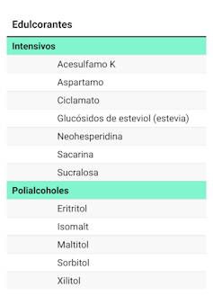 Podemos encontrar los edulcorantes en la lista de ingredientes. Pueden ser de dos tipos: intensivos o polialcoholes. Los primeros son mucho más dulces que el azúcar (poder edulcorante mucho mayor) y no aportan energía al producto.