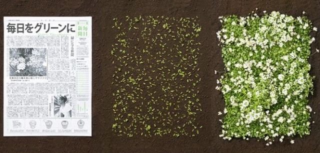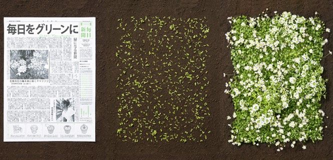Es lo que ha pasado con el diario japonés Mainichi Shimbun, que ha lanzado una edición reducida sostenible para ocasiones especiales llamada The Green Newspaper. Esta publicación, que se distribuye junto con el diario normal, está elaborada de forma ecológica con papel reciclado y fibras vegetales y contiene semillas para que, al desecharlo, pueda hacer crecer flores. Las semillas son incorporadas a la pasta de papel, que luego es prensada con las simientes dentro. También la tinta es ecológica, elaborada totalmente con sustancias de origen vegetal.