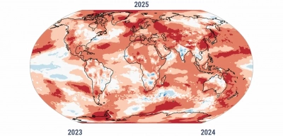 Anomalías y valores extremos de la temperatura del aire en la superficie para 2025, 2023 y 2024 / Mapa: C3S/ECMWF El calentamiento no se queda en tierra firme. La temperatura global extrapolada de la superficie del mar alcanzó 20,73 ºC, la tercera más alta tras 2024 y 2023. Y Copernicus vincula la excepcionalidad del trienio 2023-2025 a la suma de la acumulación de gases de efecto invernadero (GEI) y unos océanos inusualmente cálidos, asociados también a un episodio de El Niño y otros factores de variabilidad oceánica amplificados por el cambio climático.