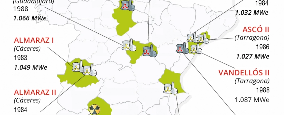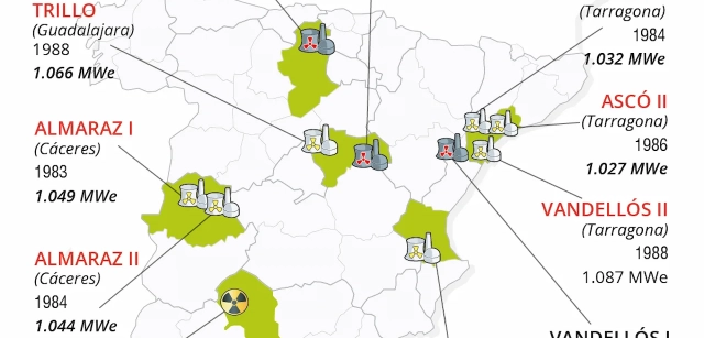 Todavía permanecen activos siete reactores nucleares en España instalados en cinco complejos. Con una producción similar en todas ellas, ligeramente superior a los 1.000 MW, los siete reactores que permanecen activos fueron abiertos durante la década de los ochenta. Los primeros en ser puestos en marcha fueron los dos reactores cacereños de Almaraz (1983 y 1984), por lo que también serán los primeros en incorporarse al calendario de cierre.