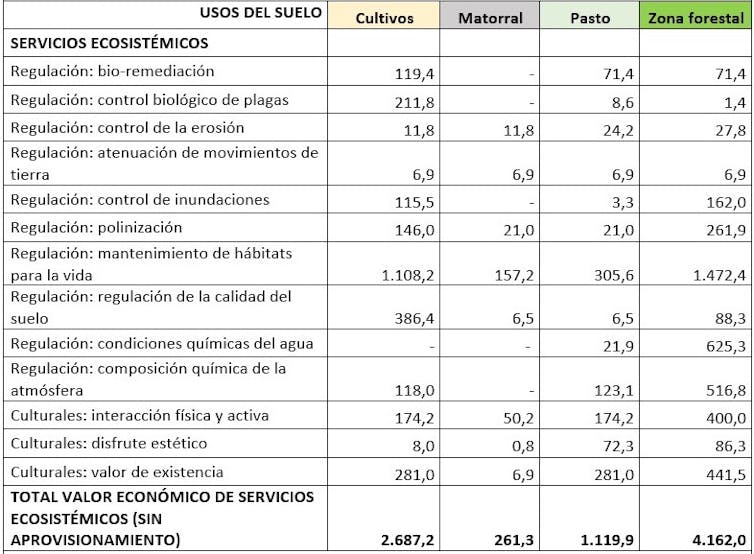La clasificación de los servicios de la naturaleza en tres grupos principales: servicios de aprovisionamiento (agua, comida, materiales…); de regulación y mantenimiento (clima, calidad de aire y agua, control de inundaciones, formación del suelo, hábitat para seres vivos…) y culturales (recreación, disfrute estético, o incluso la propia existencia de elementos ambientales).