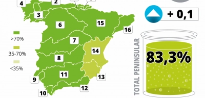 Los embalses han mantenido la senda estable de las últimas semanas, con una mínima subida de una décima para situarse en un 83,3% del total. Tras llegar a una situación de práctico llenado por las abundantísimas precipitaciones del invierno, los embalses se mantendrán en valores elevados durante toda la primavera.