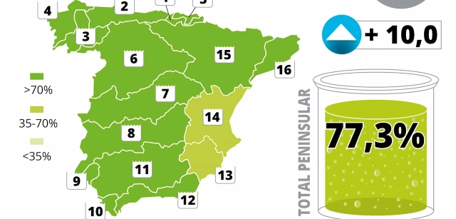 Los embalses españoles han protagonizado la mayor subida intrasemanal de su historia en los últimos días. Las sucesivas borrascas que, una tras otra, han pasado sobre la Península y provocado fuertes precipitaciones e inundaciones en varios puntos, también han dejado una fuerte huella sobre los embalses, cuyas reservas han crecido diez puntos en tan sólo una semana hasta llegar al 77,3% de su capacidad. Las lluvias previstas para esta semana y el avance del elevado caudal que transportan muchos ríos todavía pueden elevar la cifra en los próximos días, aunque en muchos casos resulte complicado por la situación de llenado técnico de muchas infraestructuras y el obligado desembalse por motivos de seguridad.