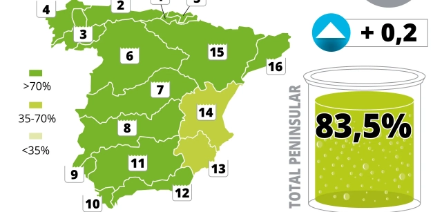 Las grandes cuencas de las dos mesetas se mantienen con una tendencia de total estabilidad. Tan sólo el ámbito del Duero ha experimentado alguna variación semanal, apenas un par de décimas más hasta llegar a la cota del 87%. Mientras tanto, las cuencas del Tajo y el Guadiana no han sufrido ningún tipo de variación porcentual, por lo que se hallan congeladas en el 80,8% y el 86,7%, respectivamente.