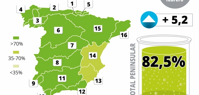 Tras el exponencial incremento de la semana pasada, los embalses prolongan la senda ascendente que supuso máximos históricos e impulsan las reservas de agua por encima del 80% de la capacidad total. Durante los últimos siete días las reservas crecieron 5,2 puntos y llegaron hasta el 82,5% de su capacidad debido a las persistentes lluvias y el avance del caudal de los ríos hacia presas por debajo de su capacidad máxima. En los próximos días parece que este magnífico crecimiento se moderará por la mayor estabilidad atmosférica y la situación de llenado de buena parte de los embalses.