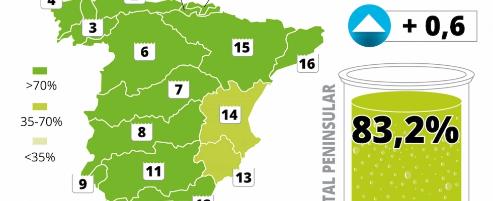 Situación de los embalses y evolución del agua embalsada en datos hasta el 17 de marzo de 2026 / Gráfico: EA En la mayoría de los ámbitos de la Península se han producido ligeras recuperaciones que ayudan a apuntalar la situación de los embalses. La mayor parte del territorio está por encima del 80% de agua embalsada, con apenas tres ámbitos de la región sureste de la Península por debajo de dicha cota. Esta recuperación hace que incluso el ámbito del Segura se sitúe por encima del 50% de sus reservas por primera vez en mucho tiempo.