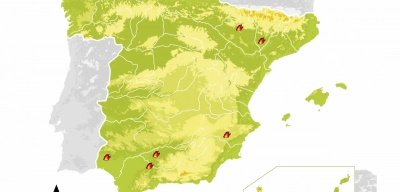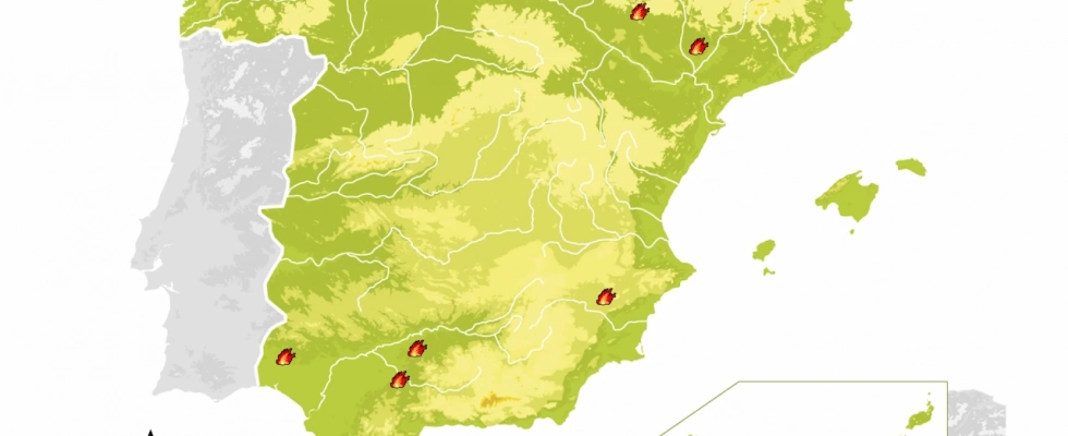 Con el tercio medio peninsular libre de siniestros, hasta cuatro incendios se sitúan en la zona sur. De este a oeste, el primer siniestro se ubica al sur de Jumilla, en el norte de la Región de Murcia. En el margen sur del tercio medio del Guadalquivir se concentran otros dos sucesos, uno al sur de la provincia de Córdoba y otro al este de Sevilla. Por último, el cuarto incendio se ha producido en el centro de la provincia de Huelva. Además de estos siniestros peninsulares, hay otro fuego en el este de la isla de Gran Canaria, cerca de la costa.