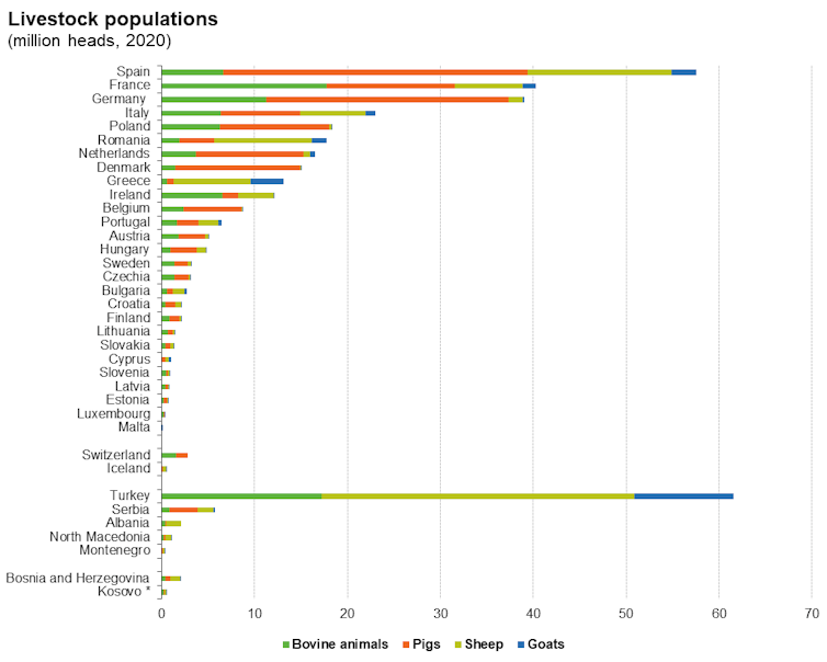 En las dos últimas décadas, los censos ganaderos globales en la Unión Europea han disminuido casi un 10 %. El descenso más considerable se ha producido en el sector ovino. No obstante, en la actualidad, España es el primer productor de ganado porcino, ovino y cunícola. También es el primer productor de leche de oveja.
