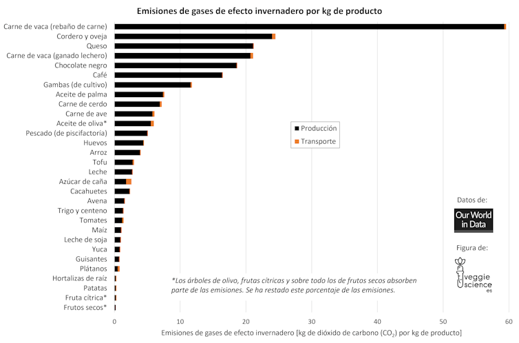 En general, los productos animales producen entre 10 y 50 veces más gases de efecto invernadero que los vegetales. Las excepciones incluyen el chocolate, el café y el aceite de palma. Por kilogramo de producto, la producción de estos alimentos genera más gases que muchos productos cárnicos.