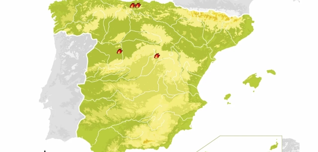 Por otra parte, los otros dos siniestros restantes se sitúan en el entorno de la Meseta norte; el primero de ellos en el suroeste de la provincia de Valladolid, cerca de Nava del Rey, y el otro incendio en plena Alcarria de Guadalajara, aunque ambos sucesos son de escasa extensión.