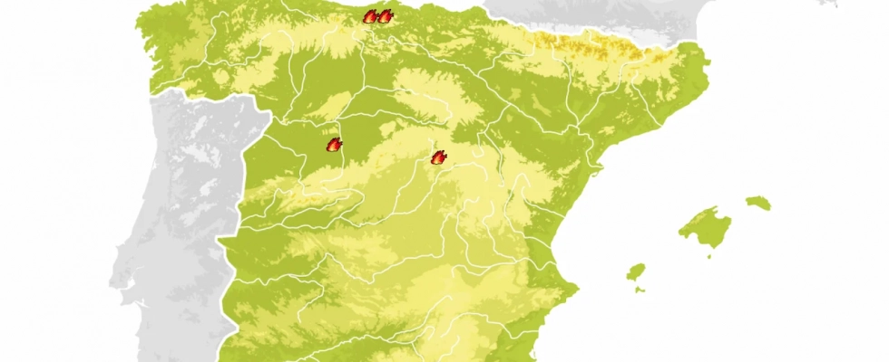 Mapa de los incendios forestales activos a 5 de diciembre de 2025 / Imagen: EA Con la mitad sur y los dos archipiélagos libres de siniestros de relativa importancia, los fuegos activos a día de hoy en la Península se sitúan en torno a dos agrupaciones. Por una parte, se encuentran dos siniestros de pequeña extensión, próximos entre sí, en la zona interior de Cantabria, muy cerca de la Cordillera Cantábrica.