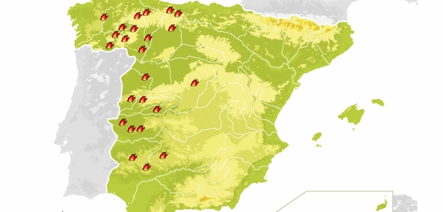 Extremadura tampoco se ha librado de esta negra situación. El más preocupante en este momento parece el de Jarilla, un fuego descontrolado al norte de la provincia que ha provocado evacuaciones y confinamientos y que amenaza con extenderse al sur de Salamanca. La provincia de Cáceres sufre al menos otros tres siniestros activos y la situación no es mucho mejor en Badajoz, donde el fuego más extenso está en Llerena, con una evolución más favorable, y donde aparecen al menos otros dos siniestros activos de consideración.