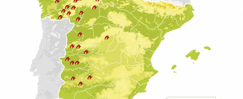 El mapa de siniestros activos en la actualidad está concentrado en la zona oeste. En una distribución de norte a sur, en las últimas horas se han producido varios siniestros de gravedad en Asturias y la Cordillera Cantábrica, con tres incendios descontrolados que afectan a la zona limítrofe entre León, Asturias y Cantabria y que habrían empezado a quemar superficie perteneciente al Parque de los Picos de Europa.