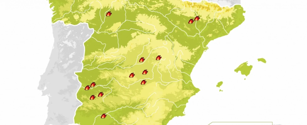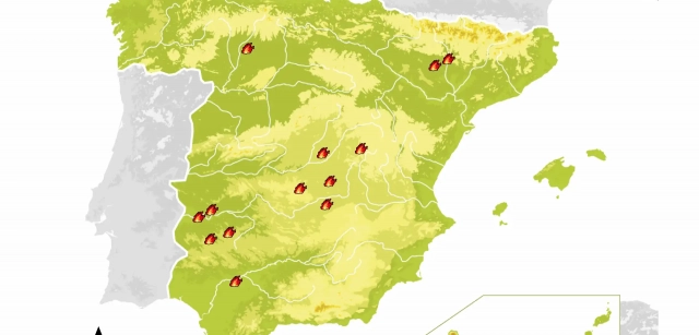 La mayor proliferación de incendios se da en la región centro, con dos núcleos principales. Uno de ellos se concentra en torno a las provincias de Toledo y Cuenca, aunque en la mayoría de los casos se trata de fuegos de escasa extensión que afectan principalmente a terrenos agrícolas. Por su parte, en la provincia de Badajoz también aparece otra proliferación de siniestros, algunos en torno al cauce del Guadiana y otros más próximos al límite con Andalucía.