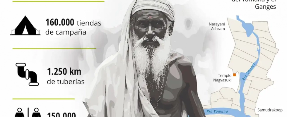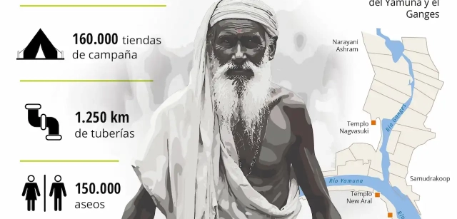 Organizar un evento de esta magnitud requiere una planificación urbana y logística sin precedentes. Para ello, el gobierno de Uttar Pradesh construye Mahakumbh Nagar, una ciudad temporal de 4.000 hectáreas, organizada en 25 sectores, con doce kilómetros de ghats en el Triveni Sangam, el punto donde se unen el Ganges, el Yamuna y el Saraswati.