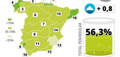 La recuperación de los embalses alcanza su octava semana de ininterrumpido ascenso, en esta ocasión con ocho décimas más que impulsan las reservas de agua hasta el 56,3% de su capacidad. Presumiblemente, este ascenso se prolongará durante las próximas semanas debido a la inestabilidad anunciada para los siguientes días que puede implicar precipitaciones en forma de lluvia, que se trasladarían rápidamente a la capacidad de los embalses, o en forma de nieve, que pasarían a formar parte de las reservas de agua con el posterior deshielo primaveral.