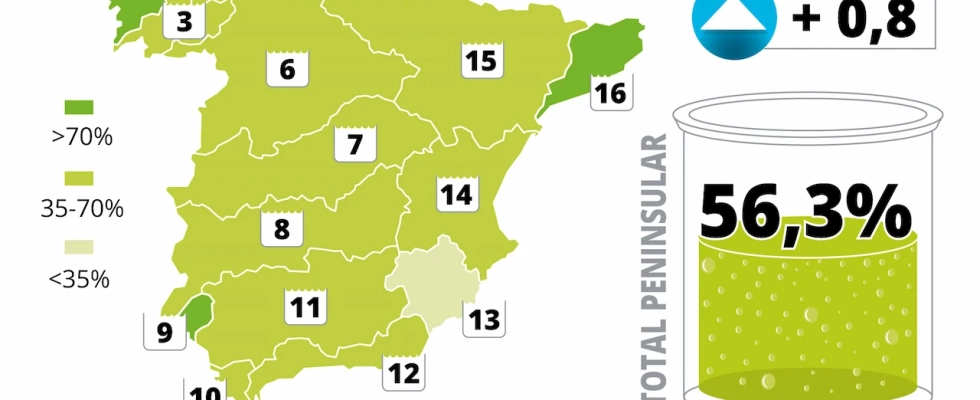 Entre las grandes cuencas de la Meseta se da el único descenso de todos los ámbitos, ya que el Duero se deja tres décimas en la última semana y cae hasta el 56,0% de su capacidad. En cambio, el Tajo y el Segura experimentan sendos ascensos de siete décimas cada uno para quedarse en un 62,0% en el caso del Tajo y en un 60,4% en el Guadiana.
