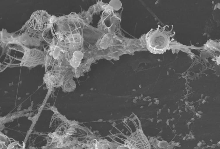 Estudiar bacterias implica hacer visible lo invisible, por lo que combinamos diversas técnicas para comprender mejor la plastisfera. Utilizamos microscopía electrónica de barrido para obtener imágenes de las biopelículas, citometría de flujo y cultivos bacterianos para cuantificar células y colonias y secuenciamos el gen ARNr 16S para identificar la sucesión bacteriana.