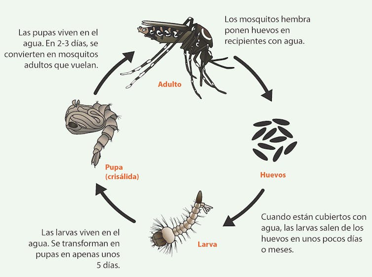 Por su parte, los mosquitos del género Culex, como el “mosquito común”, que transmiten el virus del Nilo Occidental, entre otros, han convivido con nosotros desde hace mucho tiempo. Necesitan solo una pequeña cantidad de agua para poner sus huevos y desarrollar las larvas que se convertirán en adultos.