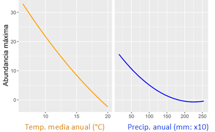 Para predecir cómo se enfrentarán las especies al cambio climático, utilizamos modelos matemáticos. Con ellos relacionamos la abundancia de cada especie con la temperatura y la precipitación registrada en cada lugar. Después, utilizamos esos modelos para predecir cuál será la abundancia de la especie en el clima futuro. Así podemos saber si se espera un aumento o reducción de sus poblaciones y dónde ocurrirán estos cambios.