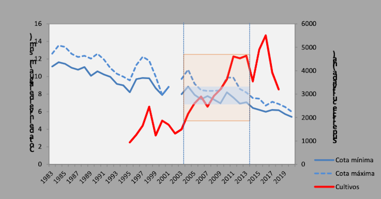 Observando la gráfica que enfrenta niveles del acuífero y hectáreas cultivadas, se pueden entender los cambios que de nuevo amenazan: el Plan de la Corona Forestal admitía las concesiones de riego otorgadas hasta 2004. La nueva propuesta aprobada en 2022 pretende admitir como regable toda la extensión cultivada hasta 2014. En el ejemplo del piezómetro que mostramos, esto correspondería a añadir un descenso piezométrico de 2,6 m a los 3,4 m que ya se detectaban en 2004.