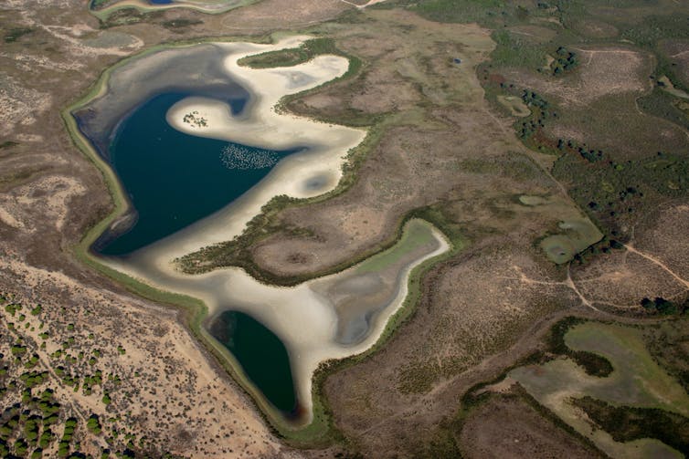 Las lagunas de Doñana dependen de las aguas subterráneas, son puntos de descarga del acuífero y se inundan según las variaciones que sufre la capa freática a lo largo del año. Cuando las lluvias recargan el acuífero, el nivel de las aguas se eleva y aflora en superficie formando las lagunas, mientras que en verano la capa freática está más profunda y las lagunas se secan.