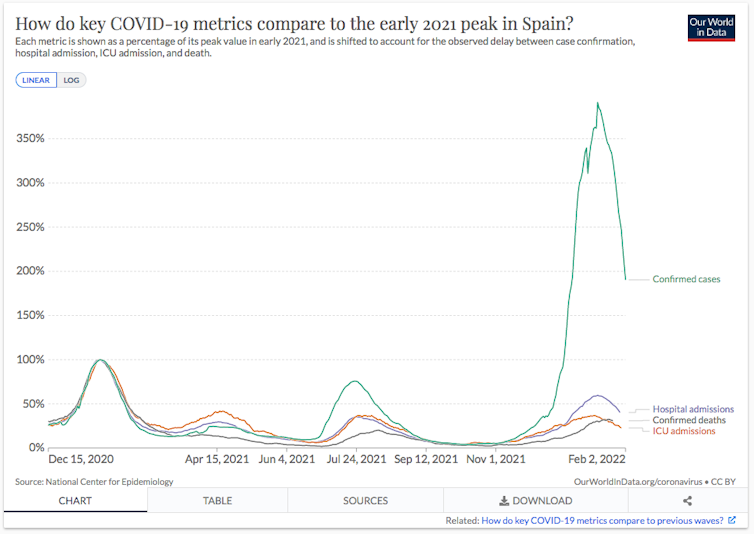 Otra evidencia que lo demuestra es que si los casos confirmados aumentan pero las hospitalizaciones y las muertes aumentan en menor medida, significará que los muchos casos notificados están provocando menos formas graves de la enfermedad y menos muertes. Lo vemos en la figura 2.
