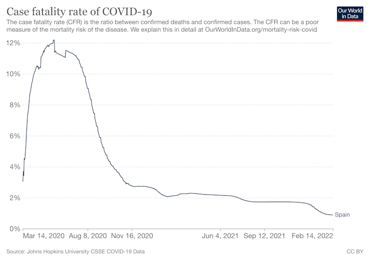 A partir de los datos de los ensayos clínicos se concluyó que las vacunas protegen de la enfermedad grave y de la muerte con un porcentaje muy alto. Y, para un estado de emergencia global, se consideró suficiente porque, tal y como se ha demostrado posteriormente, las vacunas han disminuido tanto los ingresos hospitalarios en UCIs como los fallecimientos, sobre todo entre la población vulnerable. En la figura 1 vemos cómo ha disminuido en España la tasa de mortalidad por covid-19 (relación fallecimientos/número de casos).